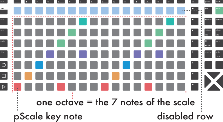 When this global pSCALE is enabled, the matrix pads only show the notes of the selected scale. There are never more than 8 notes in a scale, so the 8 rows will always show the same note.