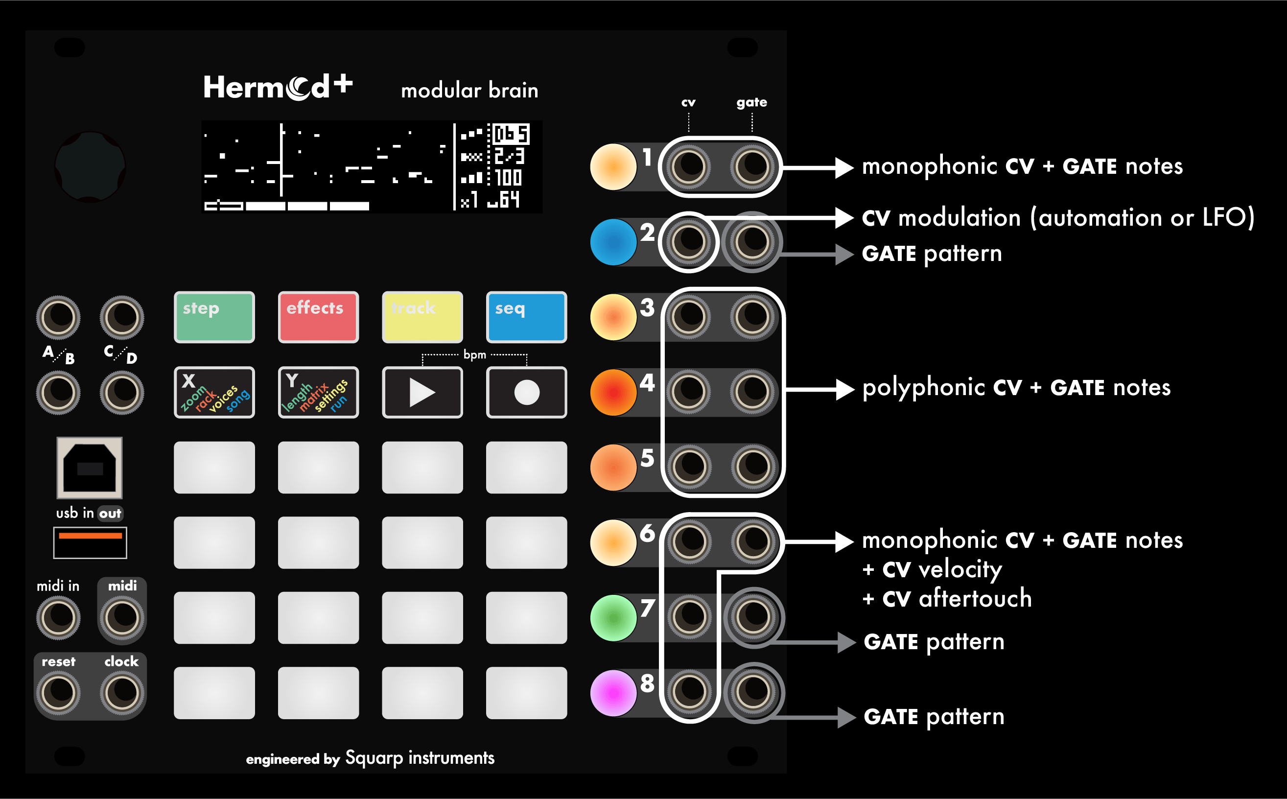 Hermod+ can adapt its voice layout to any patching scenario. Depending on your needs, any track can become a modulation output, a monophonic CV/Gate track, a polyphonic MIDI track, ...