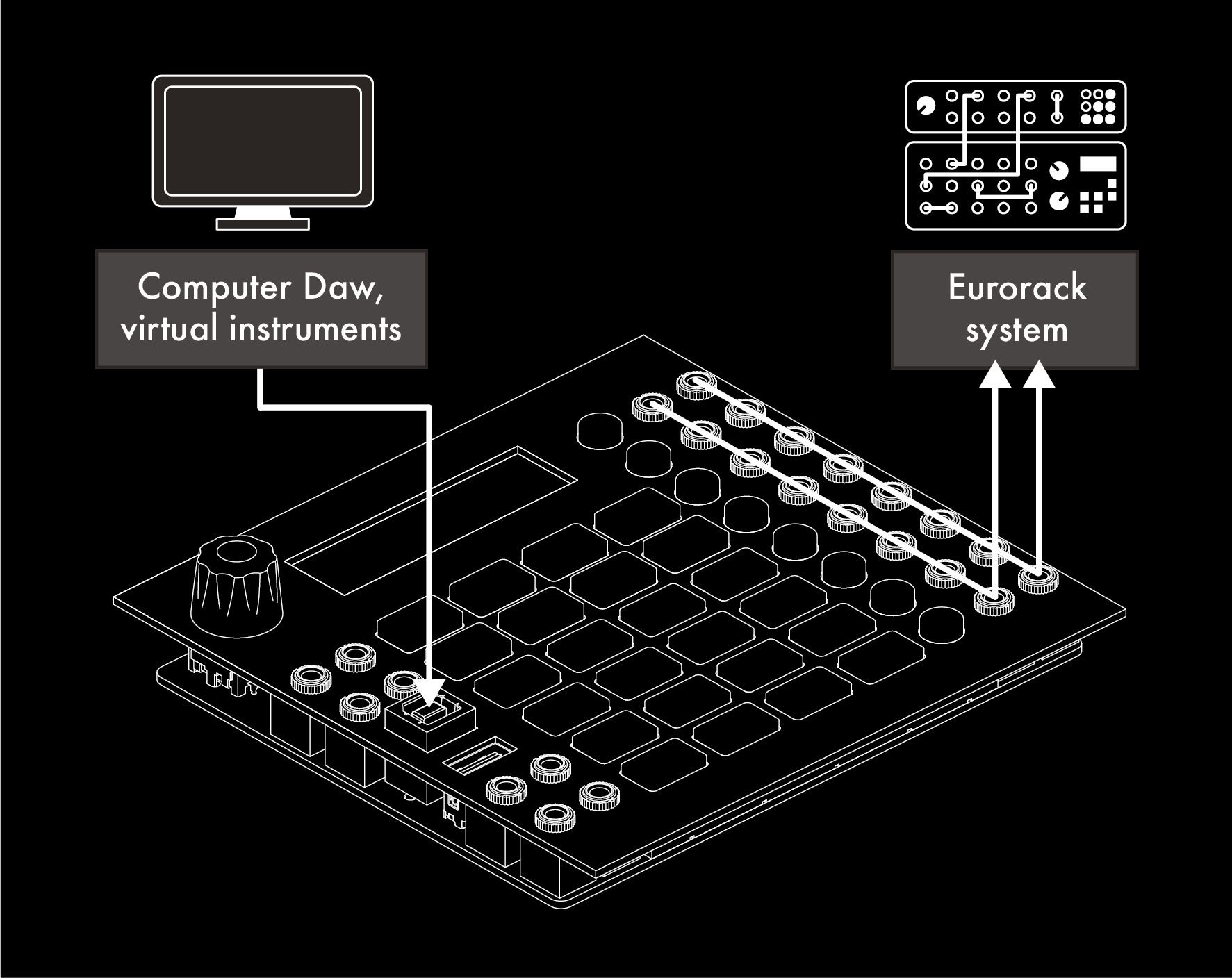 Take advantage of the 8 dedicated MIDI tracks, that can record and be programmed independently from the 8 CV/Gate tracks.