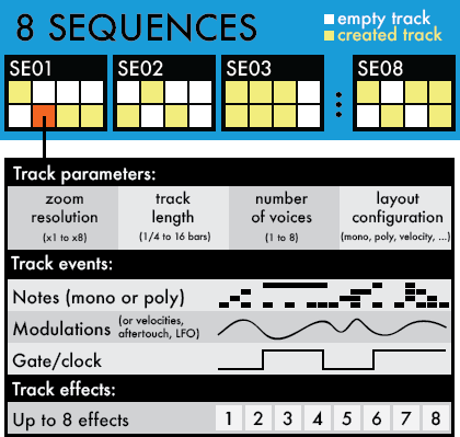 These 8 tracks are grouped into one of Hermod’s 8 sequences. Every sequence is totally independent and contains a new set of tracks to be played with, for a total of 64 tracks in a single project: