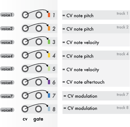 By default, each voices are assigned to output CV note pitch + their associated GATE (each track layout is set to 1 voice, mono).
