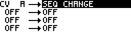 Tip If you use the 0V to +5V range and the parameter SEQ CHANGE, an input between 0V and 0.625V will select the sequence 1, an input between 0.625V and 1.25V will select the sequence 2, ..., an input between 4.375V and 5V will select the sequence 8. It's advised to add this parameter on each sequence you want to control with the CV input.
