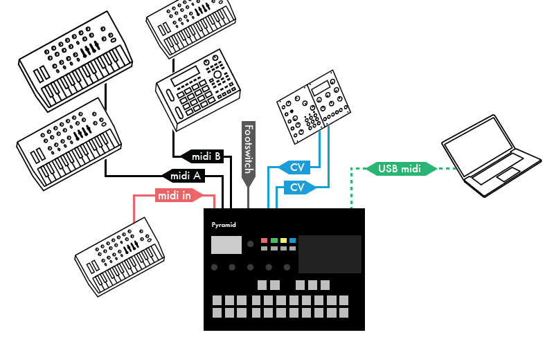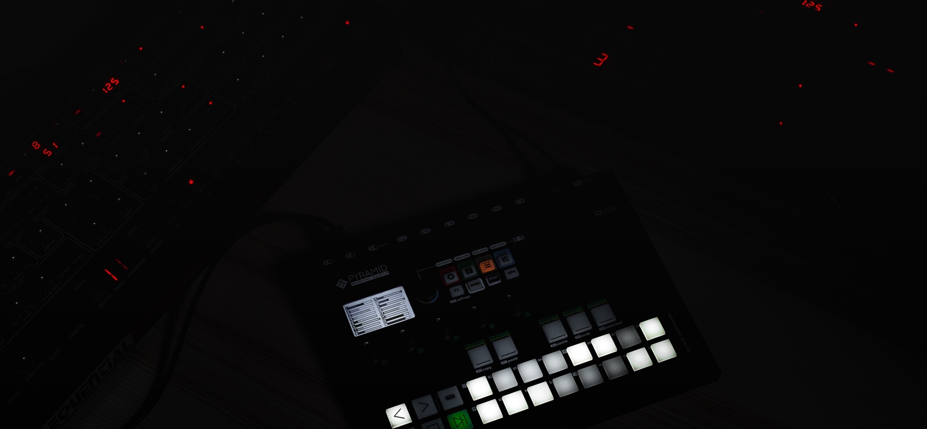 Pyramid is designed to be the perfect brain for your musical setup, from studio to stage. It brings together a powerful sequencer, a looper, a rhythm generator, a real-time effect processor, a midi controller and an input+output interface.