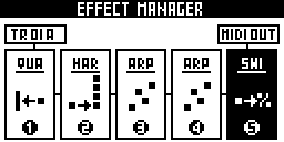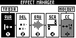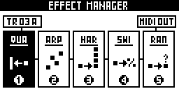 You can add up to 5 real-time MIDI effects per track, from TR01A to TR16D. Notes (played or recorded in LIVE mode, or programmed in STEP mode) are processed and sent to the outputs in real-time by the effect engines. All the effects are non-destructive.