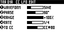 Set the amplitude of the waveform. If 0, no LFO will be generated. If +63, the LFO will be generated with the maximum range value (0 to 127). If -63, the LFO will be generated with the maximum range value, but the waveform will be inverted (127 to 0). If the value is upper 63, the LFO will "saturate".