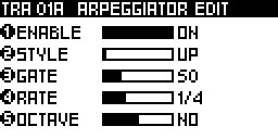 To create octaves progression. If OCTAVE=1 the arpeggiator will play the original pattern, followed by the same pattern one octave higher. If OCTAVE=-2 the arpeggiator will play the original pattern, followed by the same pattern one octave lower, followed by the same pattern two octaves lower.