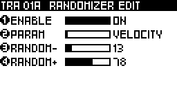 If VELOCITY selected, each note velocity will be randomized. If PITCH selected, each note pitch will be randomized. If OCTAVE selected, each note pitch will be randomized to an other octave. If NOTE LENGTH selected, each note length will set to the GRID parameter, and then randomized.
