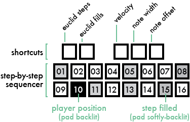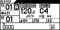 The EUCLID stepmode takes exclusive control of the track player. You can’t use it together with NOTE and CHORD stepmodes. When you change stepmodes, EUCLID is activated at the STEP pad release, and NOTE + CHORD stepmodes are disabled. As soon as you switch to NOTE, CHORD, CC MESSAGES or EFFECTS stepmodes, EUCLID is disabled again.