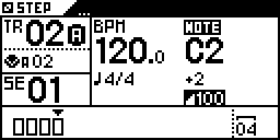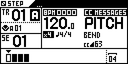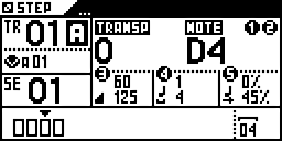 When you hold a step (or when you hold two steps to select a row of steps), the screen displays the note parameters of the selection: