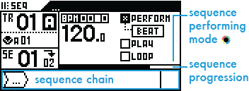 Selecting a sequence can only be done with SEQ PERFORM enable. This action is non available when "PLAY" or "LOOP" enable, because the sequencer will play the defined sequence chain (and therefore the selected sequence = the played sequence).