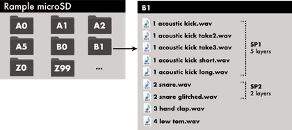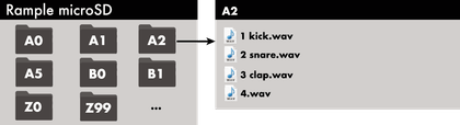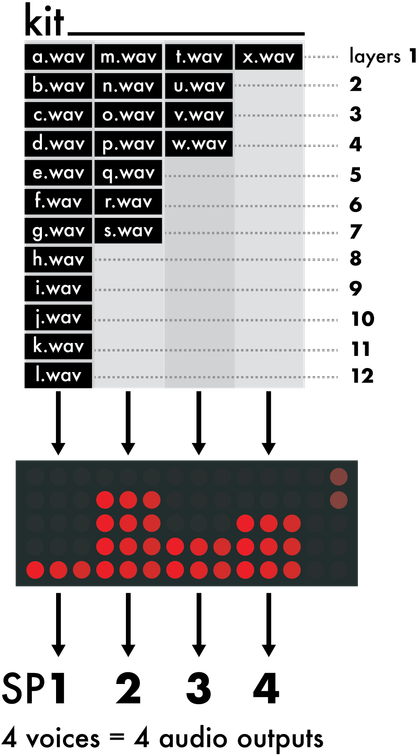Each kit folder includes up to 12 samples (.wav file) per voice. There are 4 voices: audio outputs SP1, SP2, SP3 and SP4.