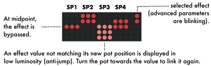 Each potentiometer controls the selected effect amount, per voice. Pot 1 will always control SP1, Pot 2 will control SP2, ...