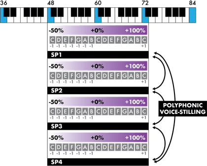 For example, set SP1 = 48 60 72 = SP2 = SP3 = SP4, then play up to 4–note chords with your keyboard!