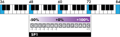 For example, if you set SP1 = 48 60 72, your midi keyboard will play SP1 across 2 octaves: